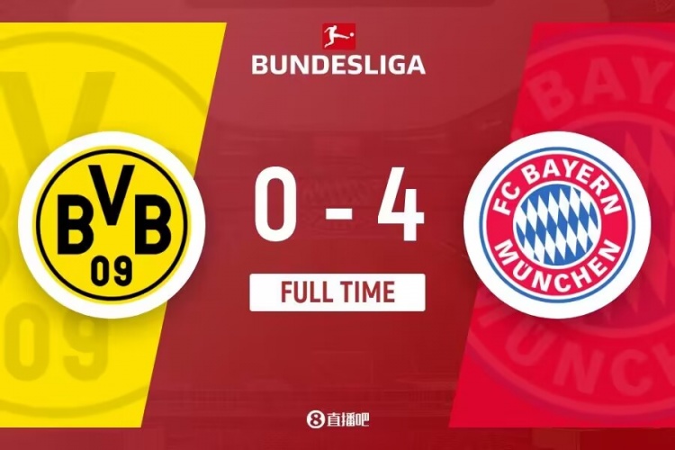 下半场伤停补时4分钟,全场比赛结束,最终拜仁4-0多特蒙德。