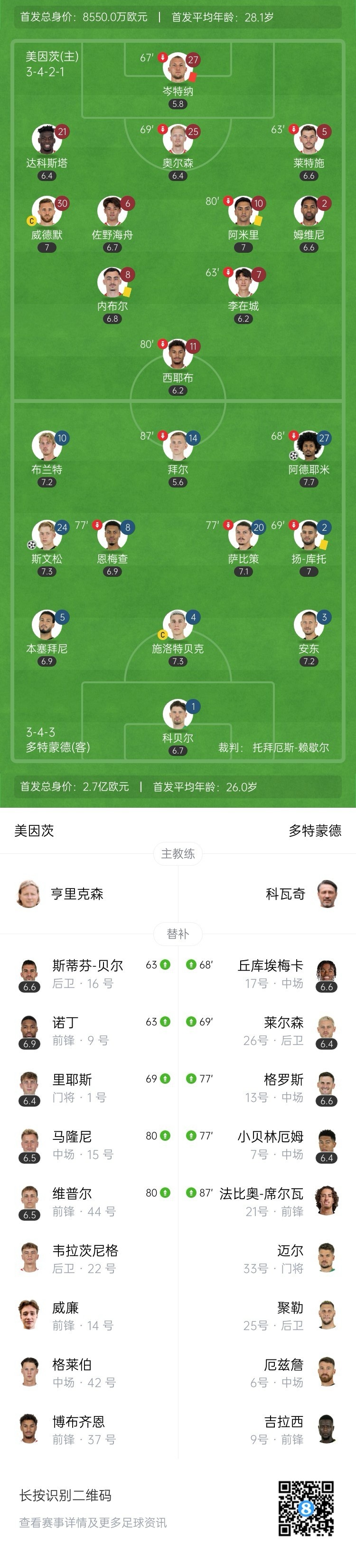 多特领先!斯文森破门+赛季首球,布兰特助攻!第27分钟,拜尔中路分球,布兰特禁区右侧低平球传向后点,斯文森小角度推射得手,美因茨0-1多特蒙德!↓