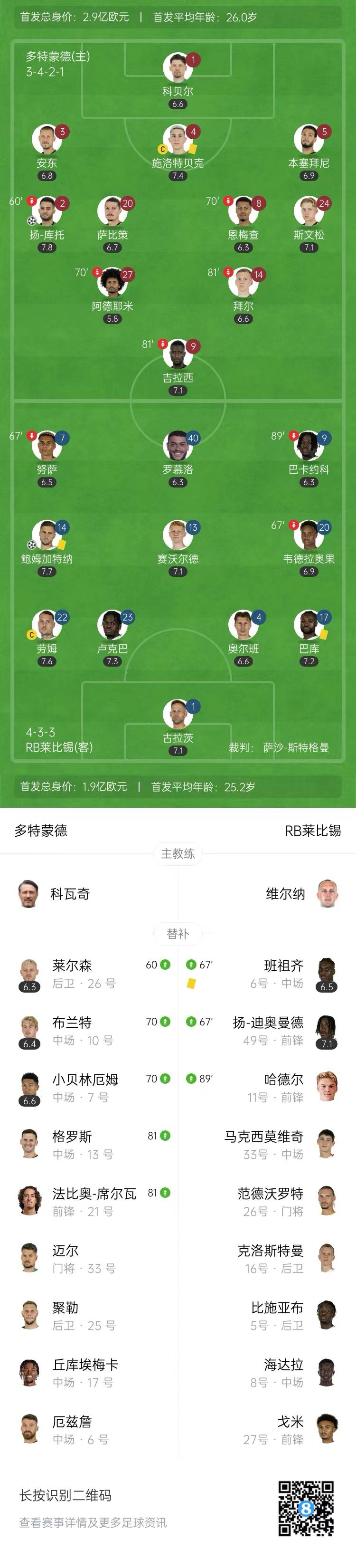 联赛四连胜遭终结!多特1-1莱比锡 扬-库托建功吉拉西助攻