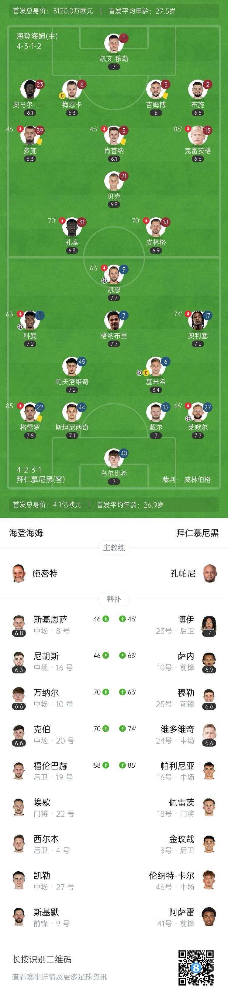 全场比赛结束,拜仁慕尼黑客场4-0大胜海登海姆。