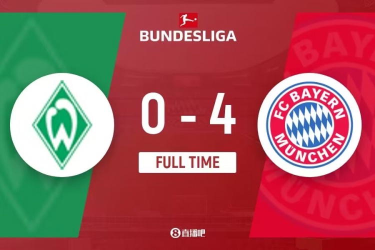 下半场伤停补时6分钟,全场比赛结束,最终拜仁4-0不莱梅。