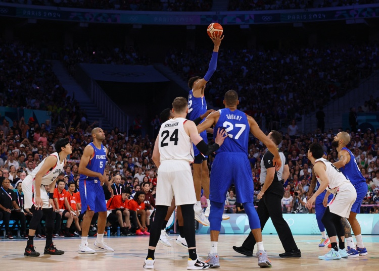 一开场,双方很快陷入缠斗,比分始终紧咬,法国不断冲击篮筐拿分,日本连中三分还以颜色,亚布塞莱连中三分,日本内外开花一波8-0一度反超比分,法国及时回暖完成9-2的小高潮,半场战罢法国49-44领先5分。下半场,日本率先发力打出8-2反超比分,此后双方展开拉锯战,比分交替领先,法国一波7-0占据主动,末节八村塁累计违体犯规被驱逐,河村勇辉3+1连得6分带队反超,双方争夺陷入白热化,戈贝尔误伤巴图姆导致后者嘴里出血,关键时刻富尼耶三分扳平比分,河村永辉4罚全中后斯特拉泽尔3+1再度抹平分差,河村永辉超远三分绝杀不中,双方进入加时。加时赛,文班亚马统治攻防两端,个人连得8分,日本连中三分但依旧无力回天。最终,法国加时94-90力克日本。