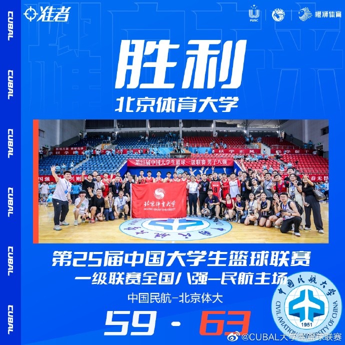 末节决战,面对如此困境中国民航并没有放弃,高宇坤内线强打命中还造成加罚,刘春雨也扔进三分,中国民航再次顽强扳平比分,杨腾飞篮下强打止血,谢智杰轻松突破再次稳住领先,虽然高宇坤接连内线取分,但北体大都能回应,尼加提三分命中后鲁骜抛投再中将分差拉开至9分,中国民航再无翻盘机会,最终北体大63-59再胜中国民航,昂首挺进全国四强。