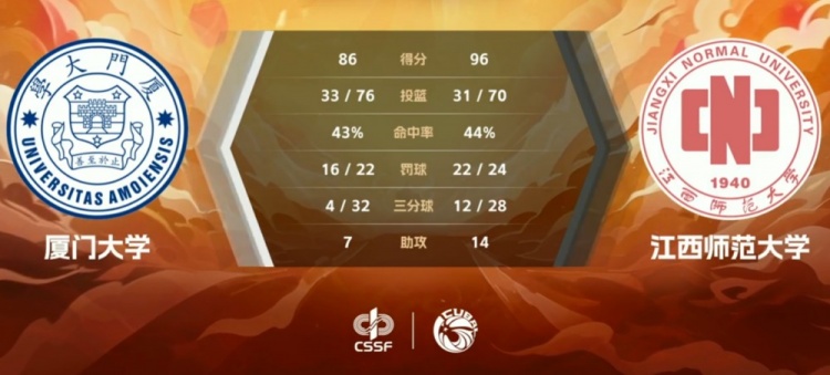 江西师范大学:王天放30分9篮板3助攻、李佳辉28分7篮板5助攻2抢断、闵定康17分8篮板3助攻、贾文鑫9分5篮板、熊权4分3抢断、丁伯儒2分3篮板2助攻。