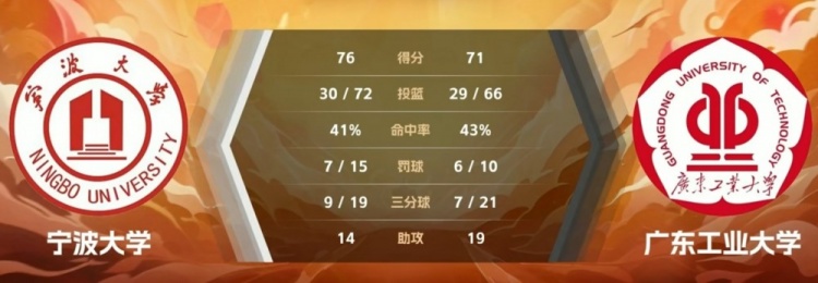 第四节,广东工大进攻端再度陷入停滞,3分钟的时间颗粒无收,宁波大学趁势将分差迫近到只剩1分,又是曾煜成挺身而出打破得分荒,双方陷入缠斗,比分咬得很紧,王立栋内线再中,关键时刻黄宇财三分将比分扳平,章海波打进后虽加罚不中,但宁波大学拼下前场篮板洪子豪三分命中,卢焯诚前场抢断抛投也为时已晚。最终,宁波大学76-71力克广东工大,获得季军。