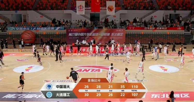 末节决战,赵家辉迎来爆发,他不仅三分连连命中,还有断球反击拿分的表现,在他神勇发挥的带领下中国海大一路追上比分并且完成反超,张天骐弧顶三分一箭穿心,田家齐再度在内线补篮得手,赵江烽关键中投命中帮助中国海大在还剩27秒时领先1分,大连理工未能把握最后一攻的机会,任宵鹏快下上篮锁定胜局,全场比赛结束,中国海洋大学110-107力克大连理工大学。