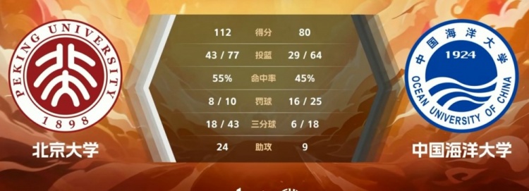 末节比赛,北大使用轮换阵容,中国海大进攻端依然办法不多,连连打铁失误,过大的分差让比赛早早失去悬念。双方最后时刻各自命中三分,北大稳扎稳打将优势转化成胜果。最终,北大112-80轻取中国海大。