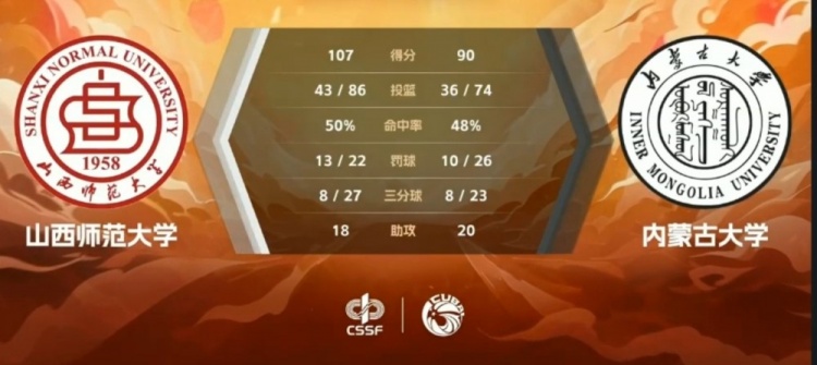 最后一节,内蒙古大学掀起反扑,一路追到只差15分,周骏两记三分为山西师大稳住局面,此后内蒙古大学未能再度缩小分差,最终山西师范大学107-90击败内蒙古大学。