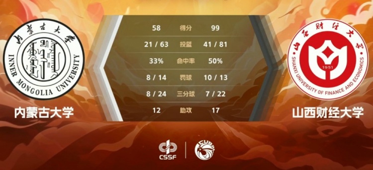 巨大分差之下双方这一节也进入练兵,琚敬强为球队拿下前4分,栗少丰则命中三分为内蒙古大学抢分,这一节山西财大依旧占据上风继续扩大领先。最终,山西财经大学大胜内蒙古大学迎来两连胜。