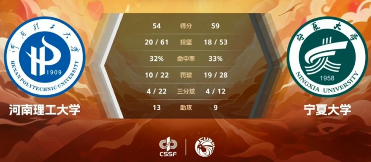 末节双方状态都大幅下滑,比赛过去6分钟的情况下河南理工仅得3分,宁夏大学仅得2分,这也导致宁夏大学在如此糟糕的进攻表现之下仍然能够保持优势占据上风,河南理工没能抓住宁夏大学熄火的机会,最后时刻还是冷先银的两次罚球为宁夏大学稳住局面守住胜利。最终,宁夏大学59-54力克河南理工大学拿下比赛。