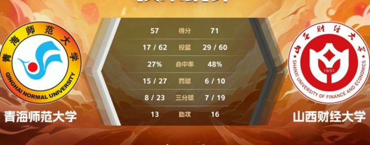 末节决战,孙晓涵和侯蕊婕攻防两端都有建树,尤其孙晓涵接连突破取分,山西财大顺势一波12-2拉开14分领先。郭昱辰和高雅茹接连造杀伤都是两罚一中,宁杨洁也走上罚球线终于止住颓势,但陈张妍和侯蕊婕接连内线打成回应杀死比赛,最终山西财大71-57力克青海师大,晋级4强。
