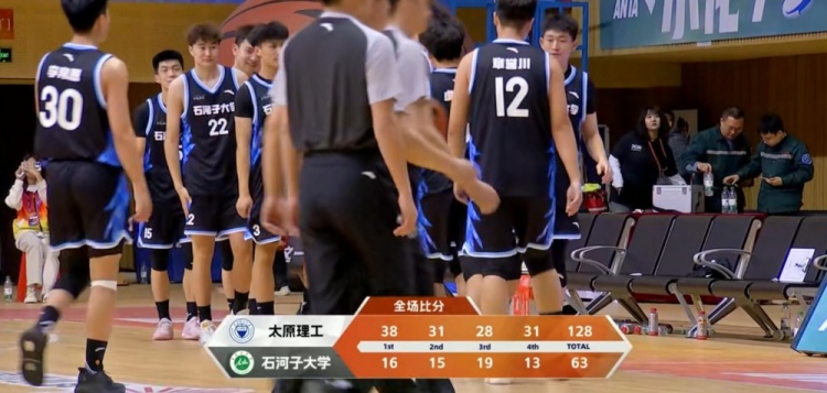 末节比赛,石河子大学换上大量替补球员,但他们的表现还可以,本节前半段能够勉强咬住比分,不过分差还是突破了六十分,比赛早已失去悬念,最终太原理工128-63大胜石河子大学。