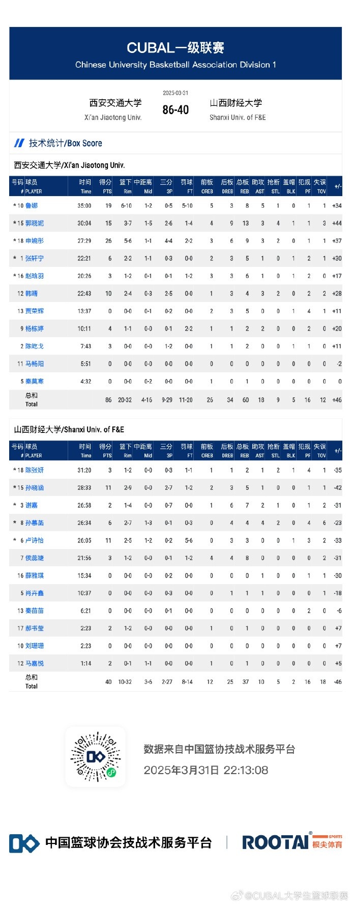 西安交通大学:申婉彤26分9篮板3助攻2抢断、郭晓妮15分13篮板3助攻4抢断;鲁娜19分8篮板5助攻、张轩宁6分5篮板、韩晴10分4篮板3助攻2抢断、赵晗羽3分6篮板、杨栋婷4分2篮板2助攻、陈屹戈3分2篮板。