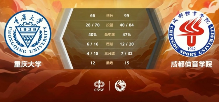 重庆大学:彭凡乘26分5板,陈俊池25分9板,徐烽荣6分
