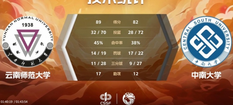 末节云南师大找回状态,李邱宇开局不久命中三分,皮昌盛则在随后连续轰进三分,云南师大开局送上17-5的攻势一举反超比分。末段中南大学一直紧咬比分但屡屡错失反超机会球,陈昱豪制造三分犯规三罚两中为云南师大稳住局面,末段他和皮昌盛连续打成关键球将优势拉大至7分锁定胜局。最终,云南师范大学89-82力克中南大学拿下比赛。