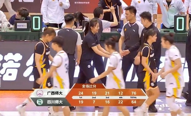 最后一节,卢嘉欣上来先进两分后广西师大陷入得分荒,四川师大不断强攻内线一路追分,栾婷婷和李傲雪外线三分也有,四川师大追到只差8分。卢嘉欣连续杀入内线上篮稳住局面,比赛时间所剩无几,四川师大未能完成逆转。全场比赛结束,广西师范大学76-64击败四川师范大学晋级四强。
