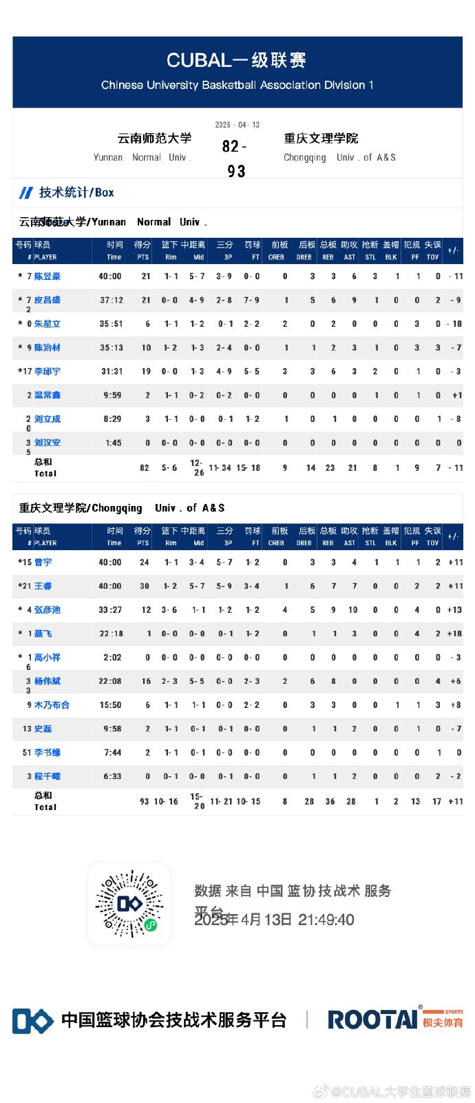 🏀CUBAL-王睿30+7+7 张彦池12+9+10 重庆文理击败云南师大进8强