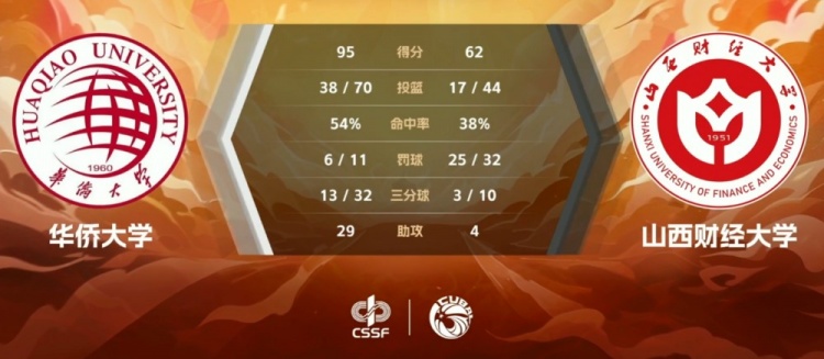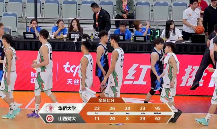 末节对决形式已经明朗,华侨大学依旧稳定输出,姜贺和曹国梁相继命中三分继续掌控比赛,山西财大虽然靠着冲击篮下拿分但依旧被动,华侨大学开局再送13-6的攻势将分差扩大至40分。这之后双方逐渐走马换将也开启练兵。最终,华侨大学95-62大胜山西财经大学拿下比赛。