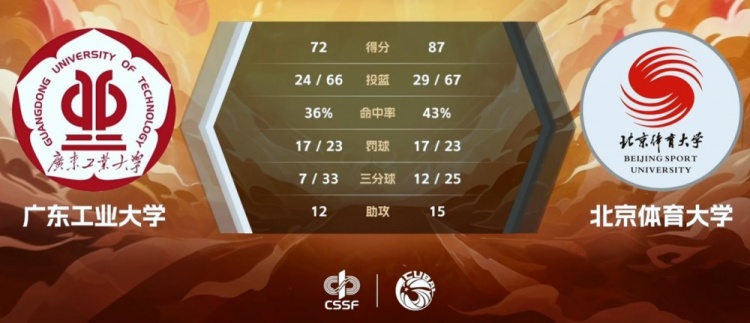 末节广东工大再度哑火,反倒是北体大在杨腾飞的连续拿分中送上11-2的攻势拉开20分的领先。这之后北体大彻底掌控局面,杨腾飞弧顶稳稳命中打板三分,祖力布哈尔和陈伟东相继得分守住大比分优势锁定胜局。最终,北京体育大学87-72轻取广东工业大学顺利杀入全国大赛八强。