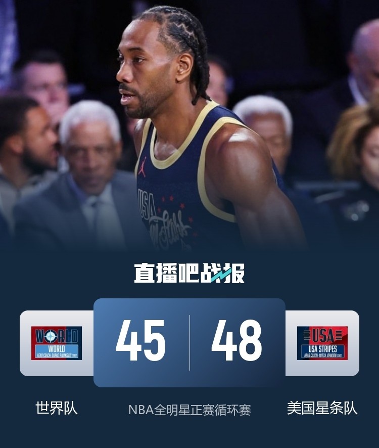 比赛上来,伦纳德率先命中三分球,不过唐斯很快就追身远投给出回应,两队一直打得十分胶着,场上多次出现平分,穆雷终于找到手感个人连拿5分,文班亚马和唐斯依旧强势,世界队逐渐取得场上领先,暂停过后伦纳德突然爆发,他连中三记三分球独得11分直接带领星条队完成反超,比赛再次打到最后,关键时刻詹姆斯补扣超出比分,文班亚马造杀伤两罚扳平,伦纳德再轰反超三分,文班亚马绝平三分不中,最终星条队险胜世界队两战全胜。