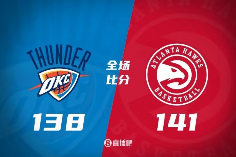 比赛开打后雷霆状态低迷,开局近4分钟内一分未得,老鹰顺势轰出11-0攻击波,亚历山大连续取分及时止血,但博格丹手感滚烫连中三分,老鹰不断杀伤保持优势,首节结束时老鹰领先14分,次节回来,切特开始发力率队追分,但老鹰内外结合总能给予回应,半场战罢,老鹰依然领先17分。易边再战后亚历山大连投带罚单节独得14分,率领雷霆连续打出小高潮缩小分差,末段老鹰再度发力回敬10-3攻击波,三节结束后老鹰保持13分优势,末节决战,雷霆没有放弃继续追分,但老鹰延续火力牢牢占优,末段老鹰进攻突然断电,雷霆一波17-4拉回悬念,但以赛亚-乔绝平三分不中,最终老鹰141-138险胜雷霆终结对手五连胜。