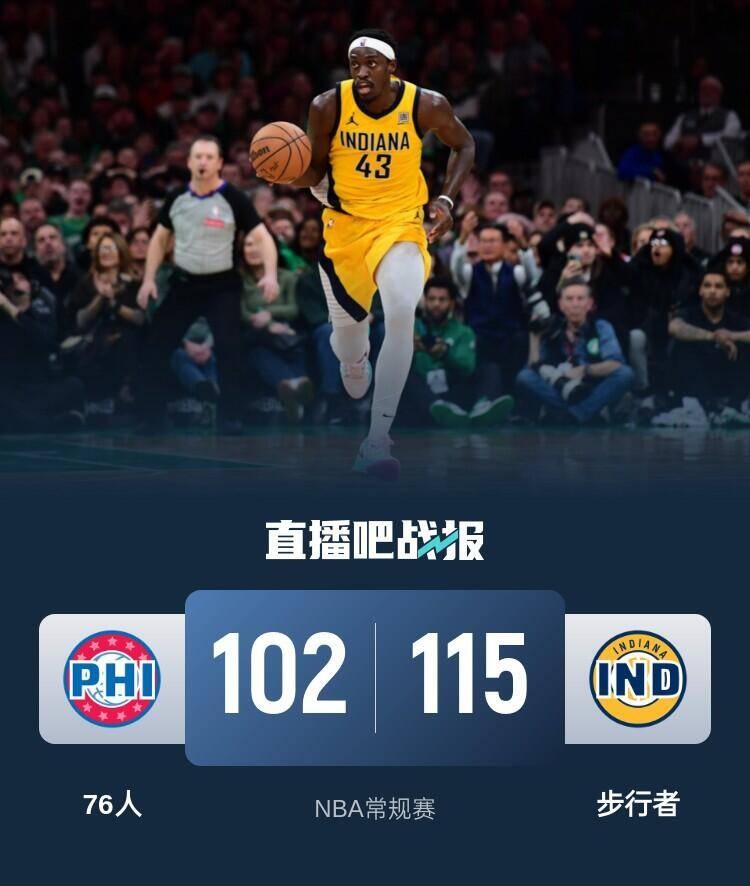 比赛上来,步行者进入状态较慢连续出现失误,76人抓住机会打出8-1的开局取得领先,不过之后步行者及时调整给出回应,也是迅速完成反超,次节步行者继续占据主动并将分差拉开到两位数,好在节末76人在马克西的带领下追了回来,半场结束时分差仅剩2分;下半场回来,76人一度完成反超,但步行者立马用一波小高潮强势回击,末节76人买有再获得任何机会,最终步行者轻取76人,送给后者五连败。