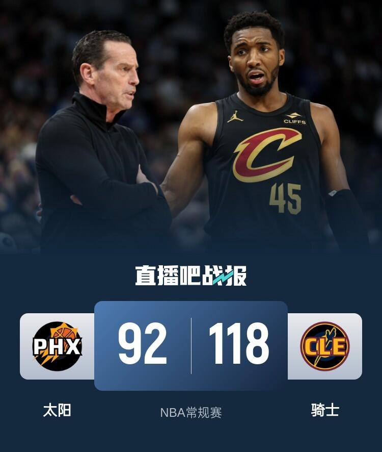 比赛开始,双方上来都迅速进入状态,展开对攻战,太阳在杜兰特和布克的牵制下全民皆兵,米切尔虽然不准,但骑士得分点多,双方你来我往首节打成27平,次节太阳进攻端受阻,杜兰特苦苦支撑,米切尔接连攻击内线状态回暖,加兰则是接连外线发炮助队半场领先到13分。下半场,斯特鲁斯接连三分助骑士13-2直接领先到20分以上分差,随后杜兰特接连干拔中投带队追分,但米切尔连续两记高难度三分还是保持23分领先,末节太阳进攻端依然不在状态,米切尔里突外投连砍11分带队拉开30分以上领先,随后双方换上替补练兵,最终太阳118-92大胜骑士。