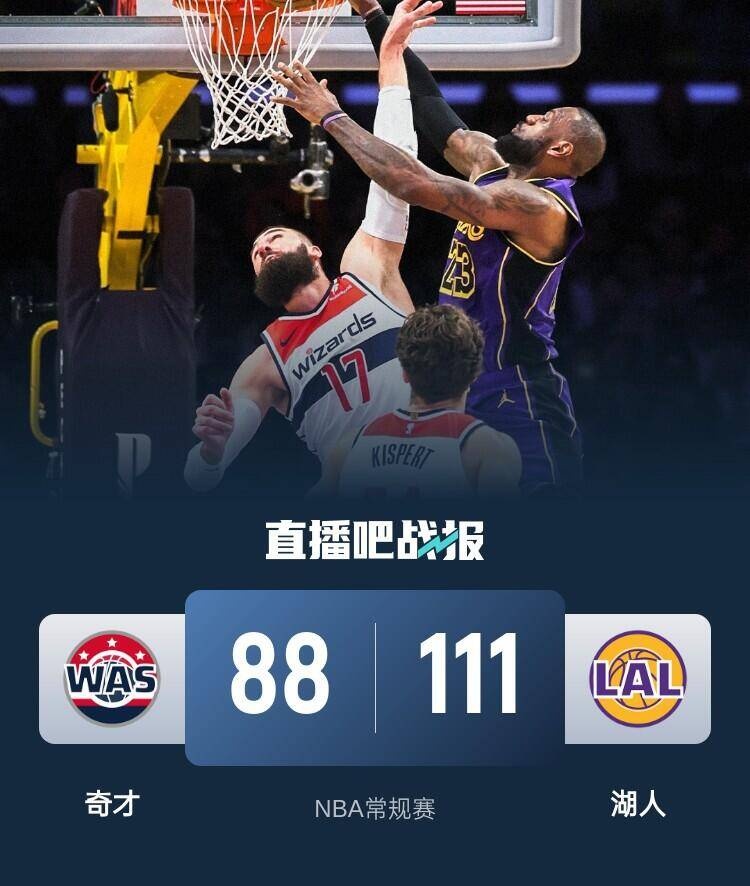 首节之争湖人虽然占据上风但场面优势并不大,在奇才首节命中率和三分命中率都在30%出头的情况下,湖人才靠着末段小优势拉开6分领先;次节湖人前期虽然一直占据上方但始终拉不开比分,不过好在詹姆斯和浓眉哥稳定输出双双在这一节拿到10分,湖人也在末段将优势拉大至10分进入下半场。休息归来湖人抢开局上来一波14-4的攻势将优势扩大至近20分,后半段湖人还是无法完全击垮对手又被奇才追至10分附近;不过整个下半场的剧本都是如此,湖人无法彻底拉开比分但奇才也无法追至个位数制造威胁,布朗尼则在最后时刻得到上场机会。最终,湖人主场轻取奇才拿下比赛。