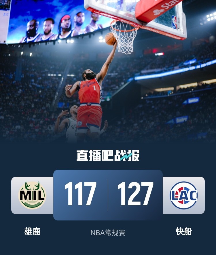 比赛开始,双方开场短暂相持,雄鹿持续发力打出9-0取得两位数优势,哈登得分助攻一肩挑带队扳平比分,次节双方继续缠斗,快船连中三分,雄鹿连投带罚还以颜色,字母哥频频冲击篮筐,半场战罢雄鹿59-58领先快船1分。易边再战,两队依旧打得难解难分,字母哥高效输出单节拿到15分,哈登连投带罚砍下17分强势回应。末节快船持续发力打出14-0将分差拉开到两位数,雄鹿苦苦追赶无果。最终,快船127-117力克雄鹿,主场过关。