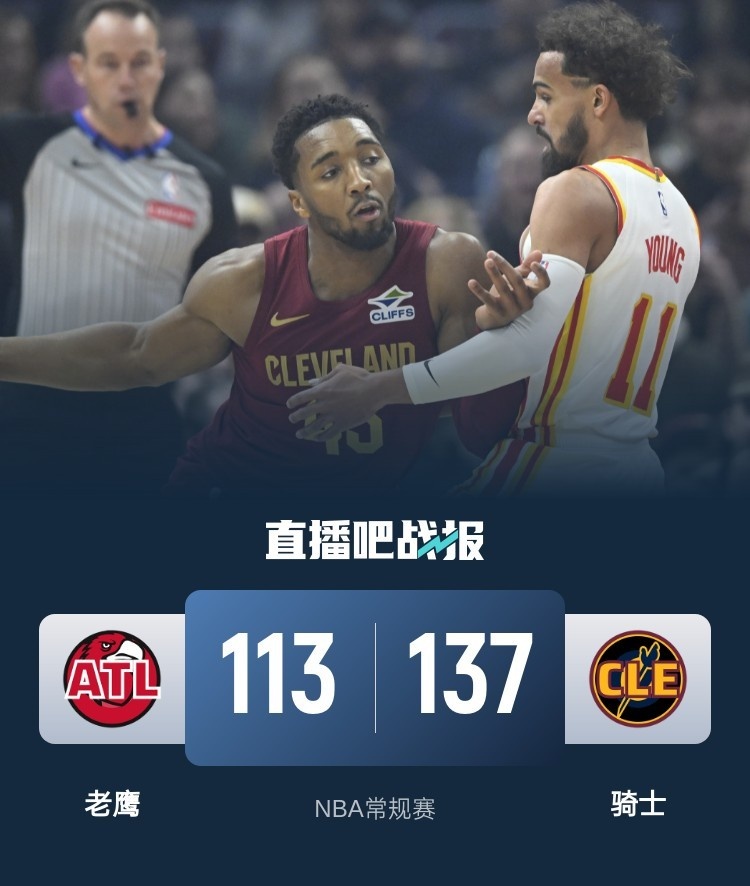 比赛开始,老鹰反客为主率先打出不错开局,加兰接连三分给出回应,双方展开拉锯战,随后骑士替补外线也接连发炮打出14-2攻击波建立双位数领先,次节骑士替补继续发力守住双位数领先,里萨谢里突外投单节轰下14分强势回应,特雷-杨连三分加罚球助队半场追到差8分。下半场,骑士众将开始发力,米切尔联赛斯特鲁斯接连外线发炮,米切尔还单节上双,骑士接连打出攻击波直接拉开20分以上领先,末节双方展开拉锯战,由于分差始终保持在20分以上,双方逐渐换上替补练兵,最终骑士137-115轻取老鹰,拿到3连胜同时送对手7连败。
