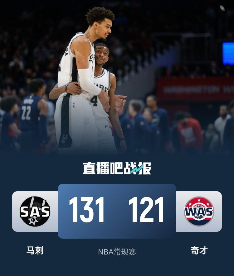 一开场,马刺率先发力,文班亚马三分3连击,保罗三分锦上添花,马刺轰出20-0的进攻狂潮,武克切维奇成为奇兵,连中三分带队回敬10-0的攻击波,次节马刺继续打铁,奇才多点开花完成反超,此后双方展开拉锯战,保罗三分帮助马刺66-63领先奇才结束上半场。下半场,两队继续缠斗,比分咬得很紧,马刺持续发力取得微弱优势,末节文班亚马和福克斯联手拿分带队确立优势,奇才后劲不足,最终,马刺131-121力克奇才,客场过关。
