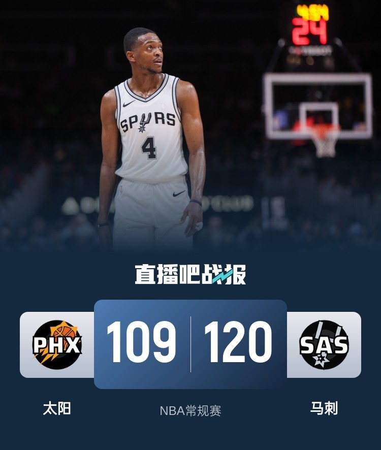 比赛开始,马刺上来就轰出8-0开局,杜兰特接连中投止血,马刺全民皆兵还是领先到双位数,太阳替补止血追分,但首节马刺还领先10分,次节马刺上来8-2拉大分差,但太阳接连三分止血回应,杜兰特联手比尔带队打出13-0攻击波一度反超比分,保罗和索汉接连三分帮助马刺半场还领先6分。下半场,布克终于运动战进球开和,杜兰特接连外线三分追分,但马刺在保罗和福克斯的串联下始终能回应,三节马刺依然领先15分,末节双方展开拉锯战,布克、格雷森-阿伦和杜兰特连续3记三分再次追上比分,但凯尔登接连内线砍下5分回应,福克斯接连突破造杀伤帮助马刺牢牢掌握住10分左右领先,最终马刺120-109力克太阳,送对手4连败。