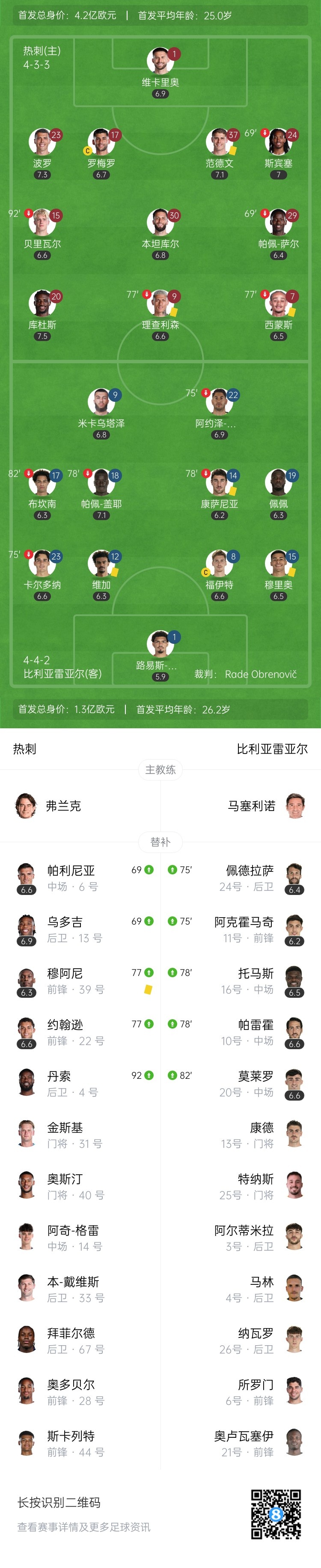 下半场伤停补时4分钟,全场比赛结束,最终热刺1-0比利亚雷亚尔。
