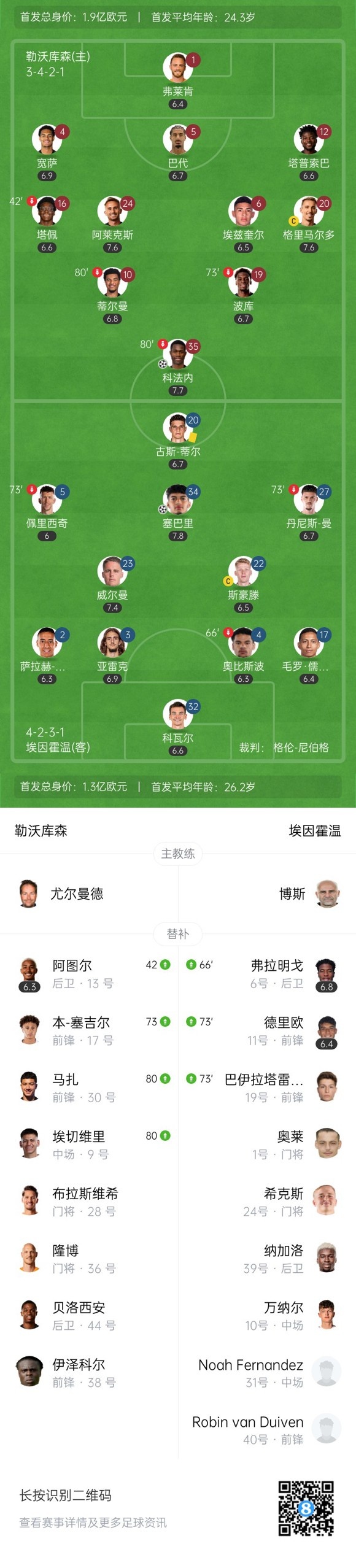 第64分钟,药厂打破僵局!科法内前场禁区抢断奥比斯波后单刀推射破门,勒沃库森1-0埃因霍温。↓