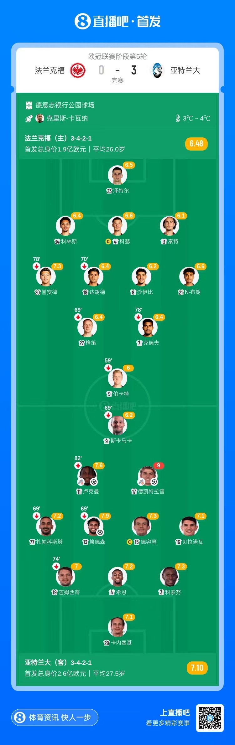 5分钟3球!亚特兰大3-0法兰克福 卢克曼+德凯特拉雷双双传射