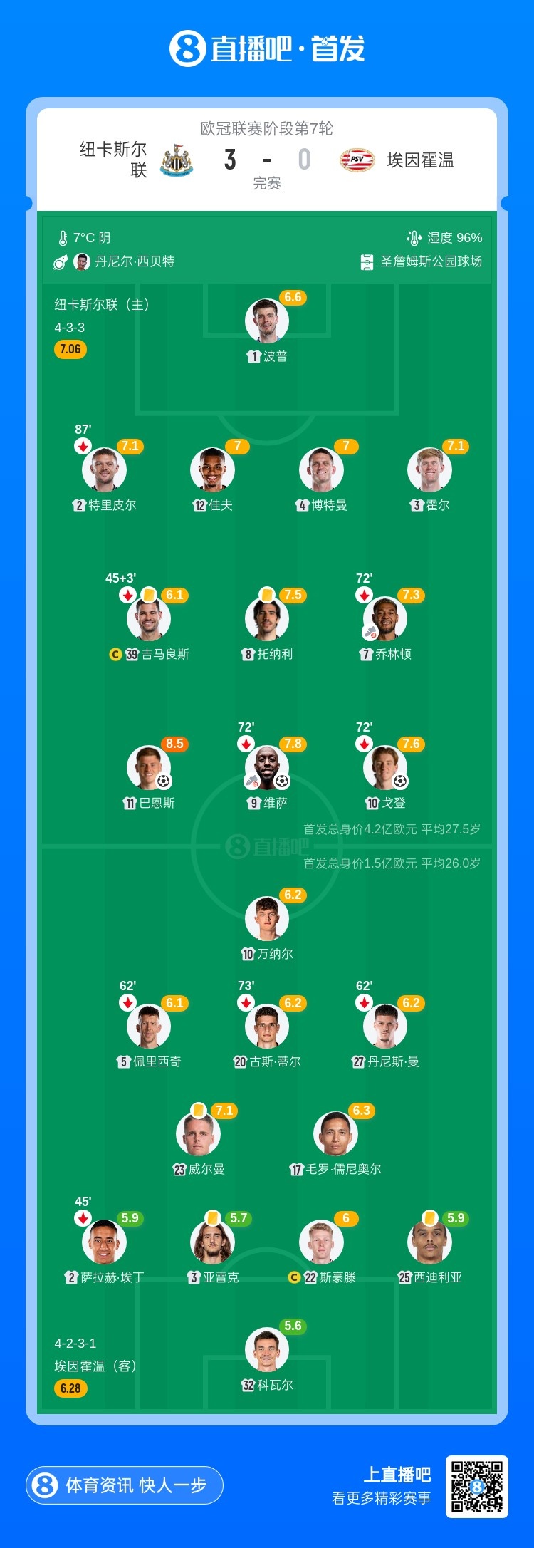 升第7!纽卡3-0埃因霍温各赛事4场首胜 维萨传射戈登、巴恩斯破门