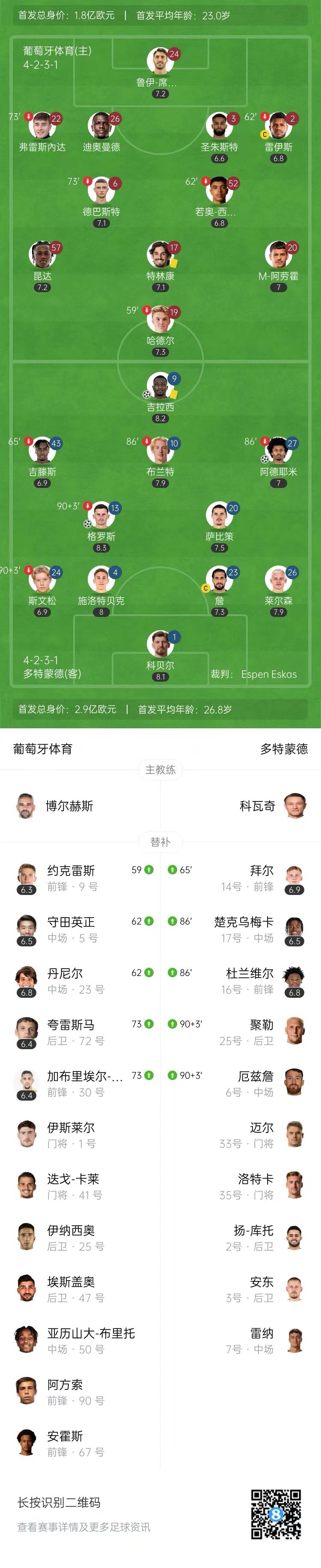 2月12日讯 北京时间2月12日4:00,欧冠淘汰赛附加赛首回合多特蒙德做客若泽-阿尔瓦拉德体育场挑战葡萄牙体育。上半场,阿劳霍远射击中横梁,吉拉西禁区倒地但主裁判示意没有犯规。下半场,吉拉西头槌破门打破僵局,随后助攻格罗斯扩大比分,布兰特助攻阿德耶米再入一球锁定胜局。最终,多特蒙德客场3-0击败葡萄牙体育,两回合较量中占得先机。