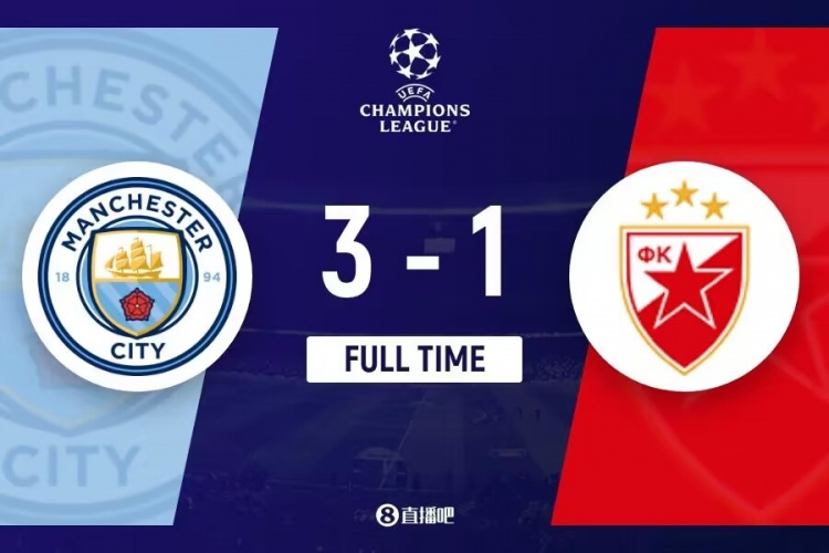 下半场伤停补时4分钟,全场比赛结束,最终曼城3-1贝尔格莱德红星。