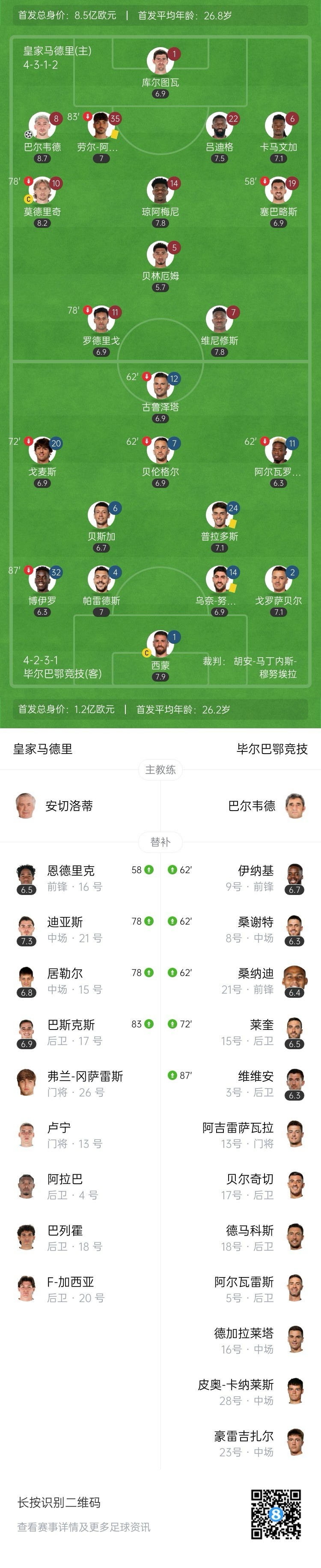 全场比赛结束,皇马1-0毕尔巴鄂竞技。