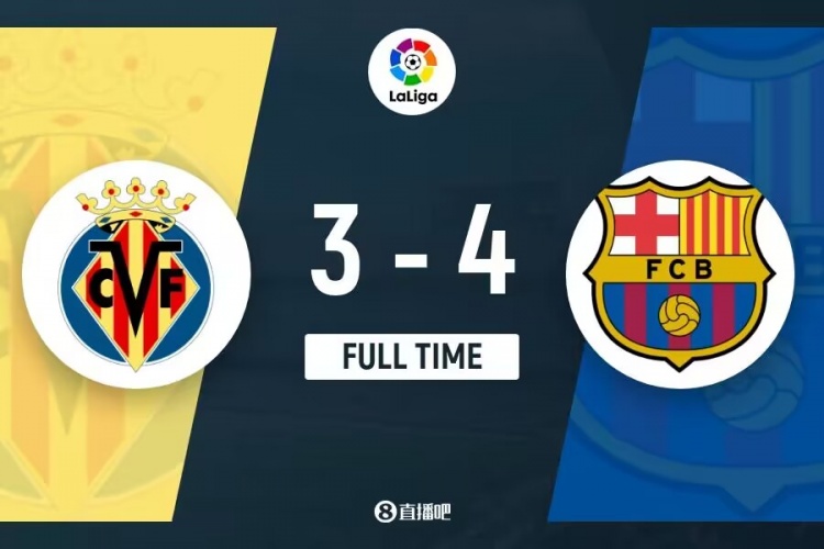 全场比赛结束,巴塞罗那4-3比利亚雷亚尔。