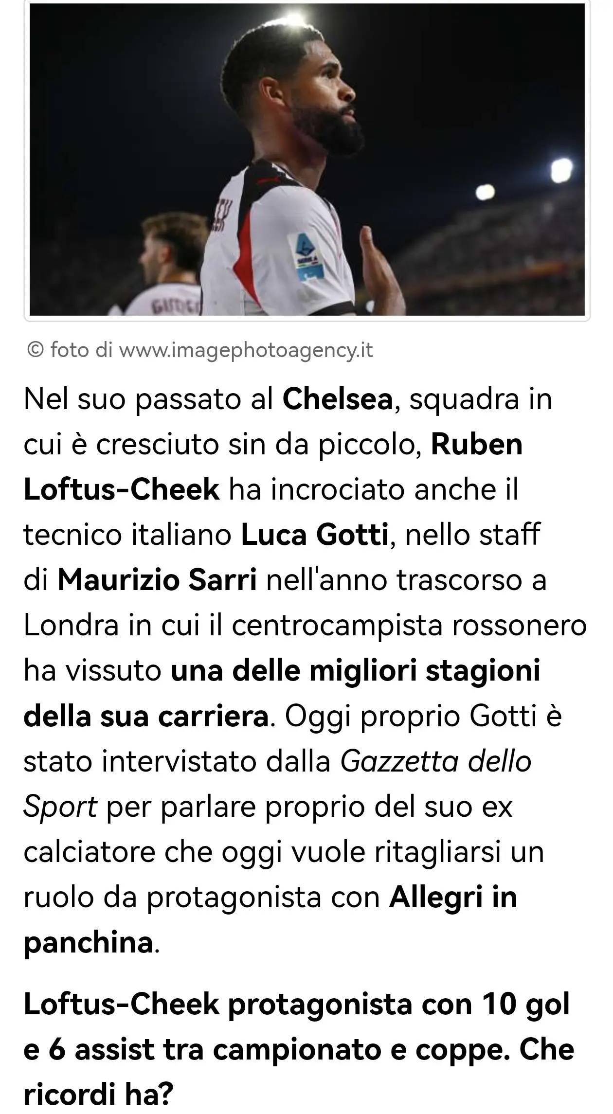 今日,戈蒂接受了《米兰体育报》的采访,专门谈及这位昔日弟子——如今洛夫图斯-奇克正努力在阿莱格里麾下争取主力位置。