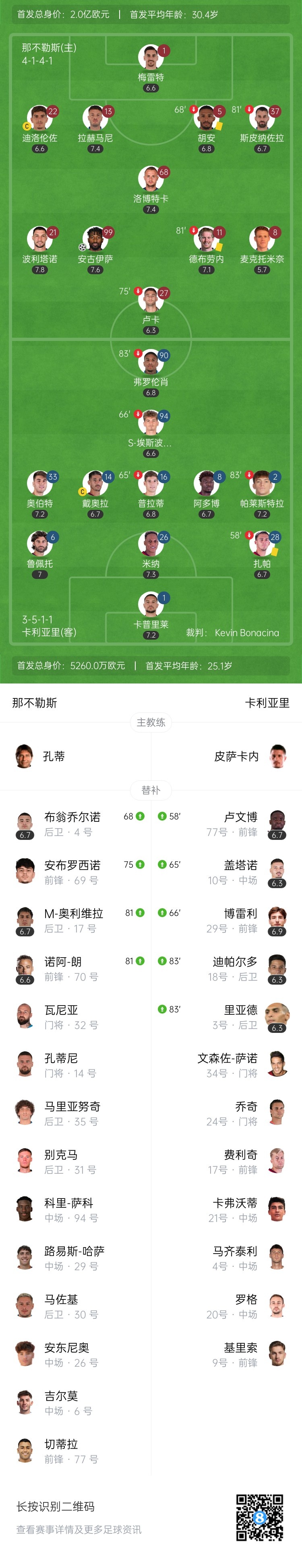 8月31日讯 北京时间2:45,意甲第2轮那不勒斯vs卡利亚里。上半场,双方均无建树。下半场,安古伊萨95分钟绝杀!最终,那不勒斯1-0战胜卡利亚里,新赛季意甲开局2连胜!