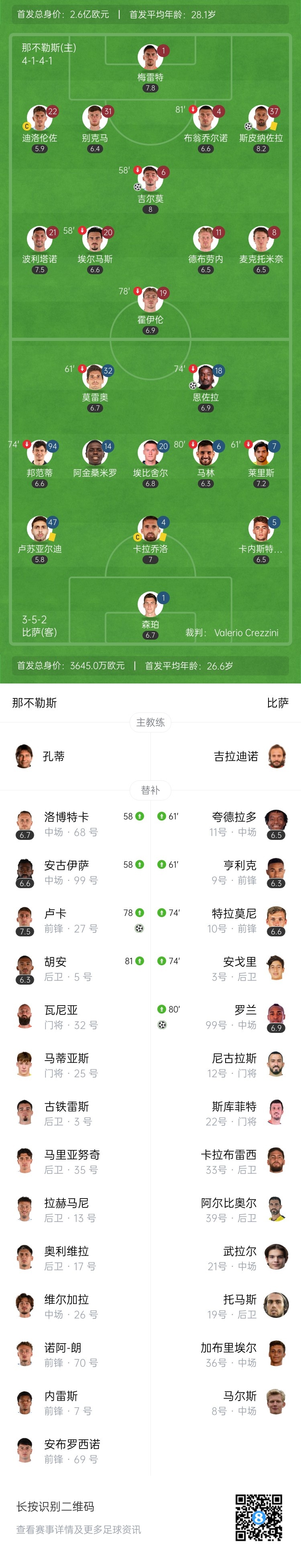 第73分钟,比萨禁区内解围失误,斯皮纳佐拉左肋得球抗住防守内切后低射贴地斩入网,那不勒斯2-1再次领先↓