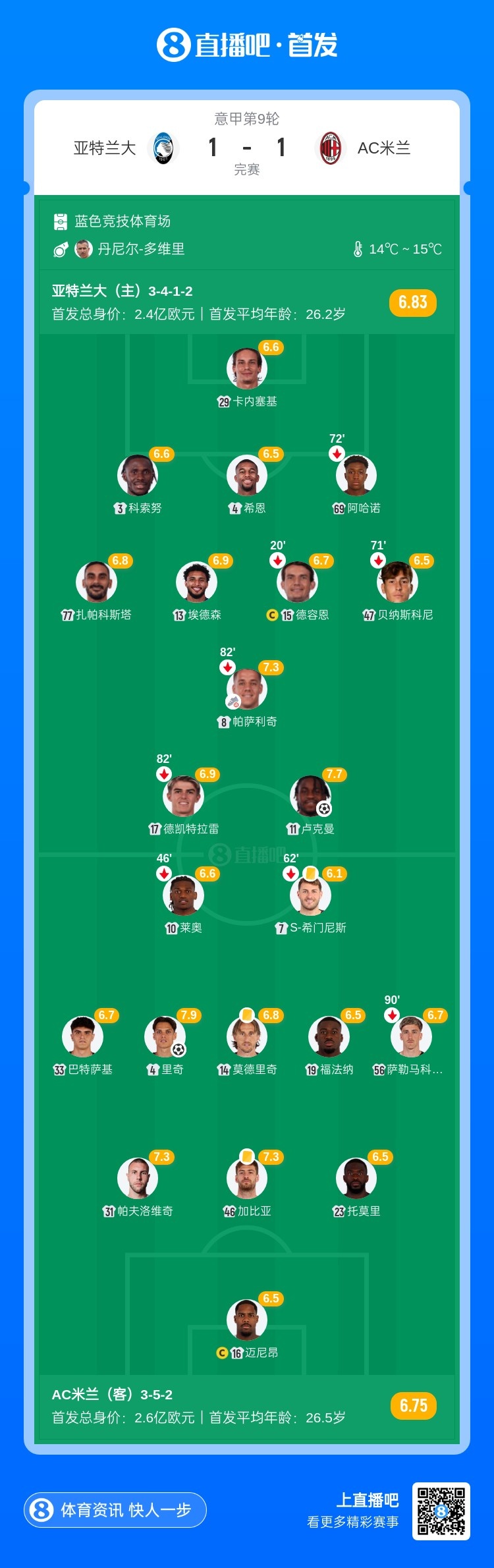 下半场补时5分钟。最终全场比赛结束,亚特兰大1-1米兰。