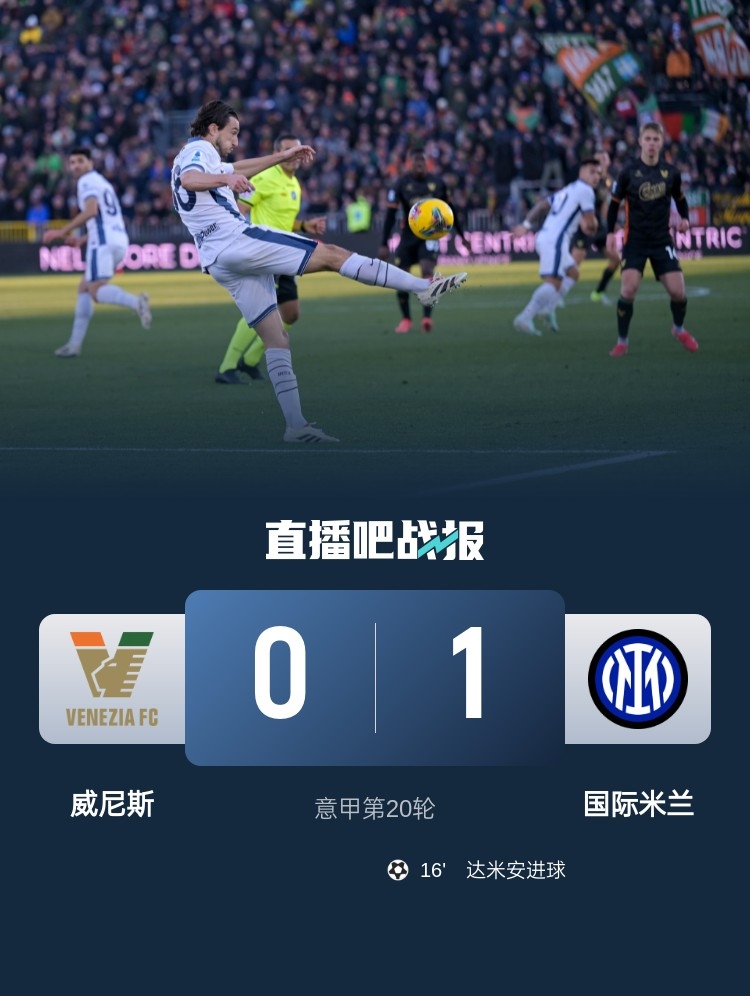全场比赛结束,国米1-0威尼斯。