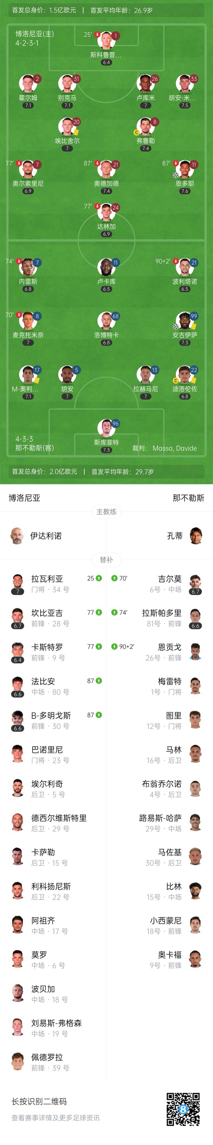 全场比赛结束,那不勒斯1-1博洛尼亚。