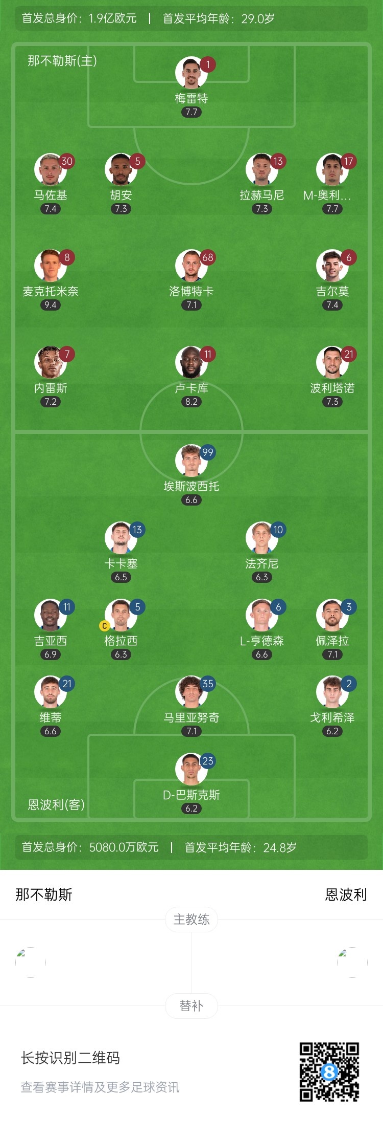 第76分钟,那不勒斯左路配合后下底倒三角回做,门前包抄的卢卡库错失绝佳良机↓