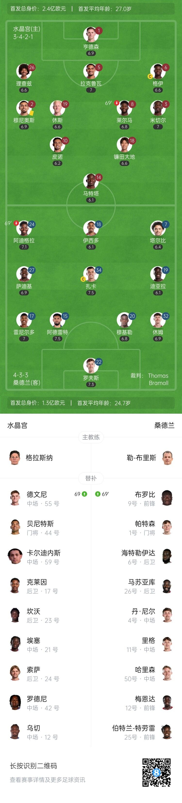 9月13日讯 北京时间9月13日晚上22:00,英超第4轮,水晶宫坐镇塞尔赫斯特公园球场迎战桑德兰。上半场,皮诺失单刀。下半场,镰田大地远射造威胁,罗夫斯屡屡救主。全场结束,水晶宫0-0桑德兰。本场过后,水晶宫1胜3平积6分排名第七,桑德兰2胜1平1负积7分排名第五。