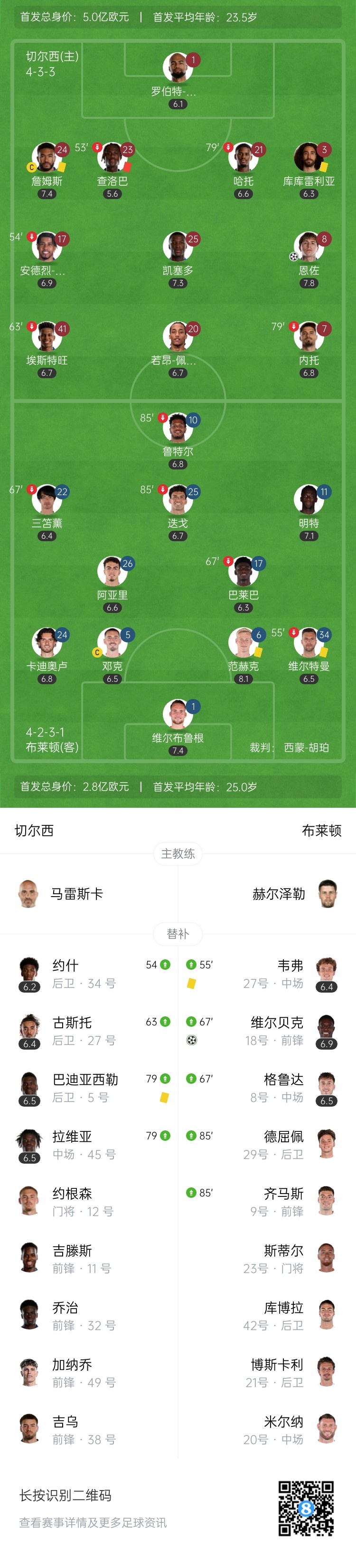 下半场伤停补时11分钟,全场比赛结束,最终切尔西1-3布莱顿。