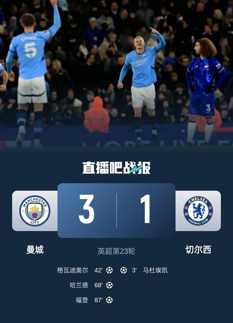 1月26日讯 北京时间1月26日凌晨1时30分,2024-25赛季英超第23轮焦点战在伊蒂哈德球场展开角逐,曼城主场迎战切尔西。上半场胡桑诺夫首秀失误致丢球+传球失误犯规染黄,马杜埃凯破门,杰克逊助攻&失良机,格瓦迪奥尔扳平,下半场哈兰德传射,福登破门,桑切斯出击失误。最终曼城主场3-1逆转双杀切尔西,曼城联赛6轮不败,切尔西近7轮仅1胜。积分榜方面,蓝月亮积41分重回前4名,蓝军积40分下滑至第6名。